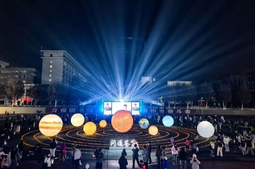 西部操场上巨大的太阳系设备在夜晚点亮,太美了,很有地大特色。