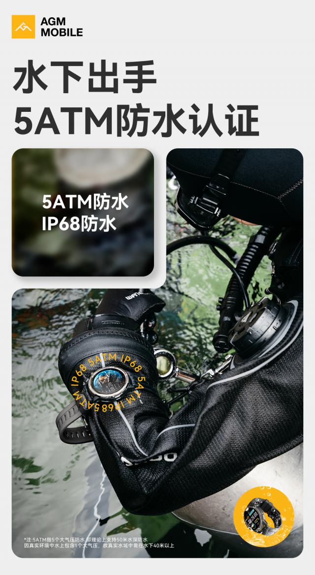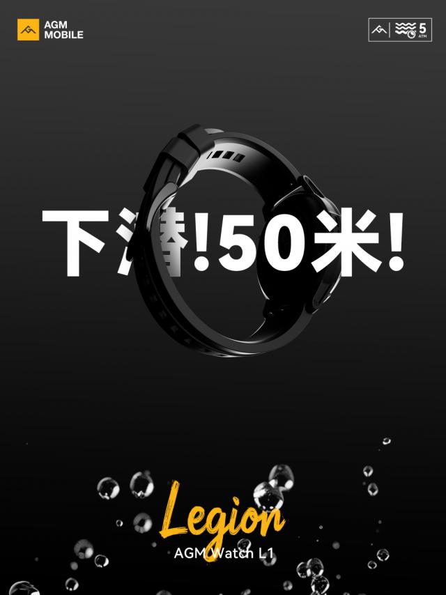 据介绍,AGM 第一款智能手表 Watch L1 拥有 5ATM(相当于 5 一个大气压)等级防水功能,理论上支持 50 米水深防水,官方提供一年期进水保修服务。
