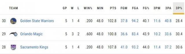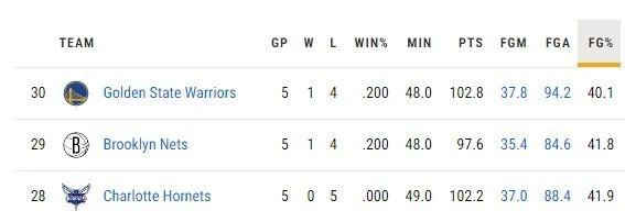 在过去的五场比赛中,勇士的投篮命中率和三分命中率同时跌至联盟倒数第一。在这五场比赛中,勇士的战绩只是 1 胜 4 负面,场均得到 102.8 分数,排在联盟第一 27(倒数第 4)。不仅如此,勇士场均投篮命中率 三分命中率40.1% 两项数据均排在联盟垫底的28.4%。