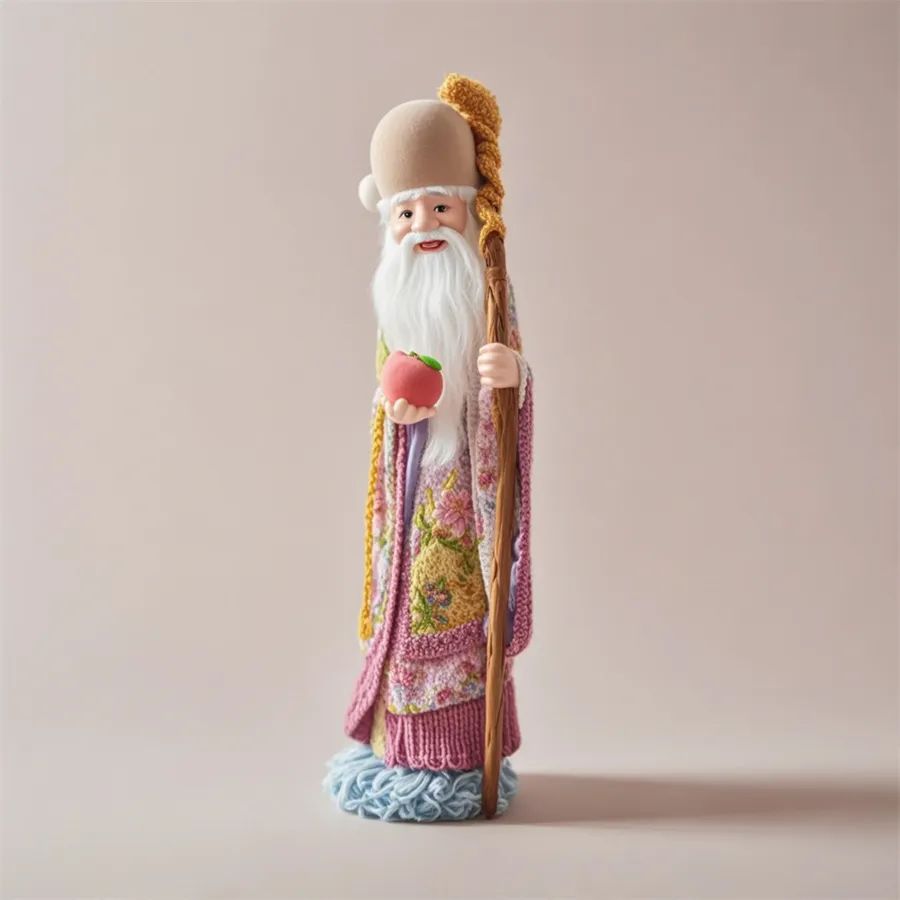 象牙。所刻寿星慈眉善目,身着儒服。胸前飘着两条长须,腰系宝葫芦,左手拿着龙头拐杖,左手拿着寿桃。