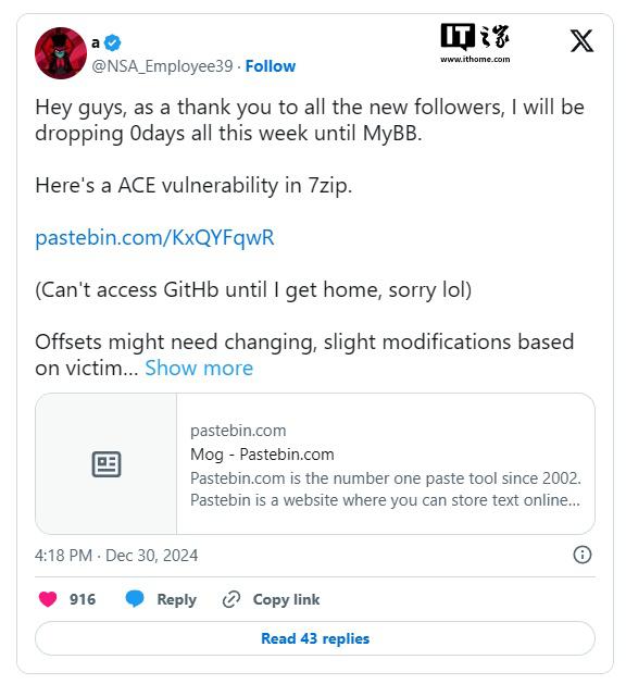 IT 世家 1 月 1 昨天的日消息 X 平台用户 @NSA_Employee399 针对流行的开源解压工具发布了疑似解压工具 7-Zip 零日漏洞检测代码。不过,这个消息很快就被发现了 7-Zip 作者 Igor Pavlov 反驳为虚假消息。其它网民也是对的 @NSA_Employee399 帖子的内容提出了质疑,有人推断代码可能是由大语言模型组成的。 ( LLM ) 生成。