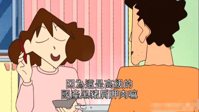 这顿火锅大餐最大的亮点就是一盘“国产高档黑猪肩胛肉”。父亲尝了一口,立刻称赞肉的美味。小新也很喜欢吃肉,大喊要多吃。