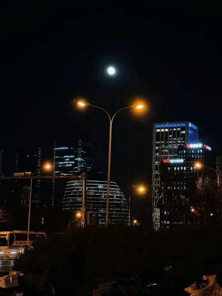 有时候,月亮会巧妙地与路灯一起“造景”。
