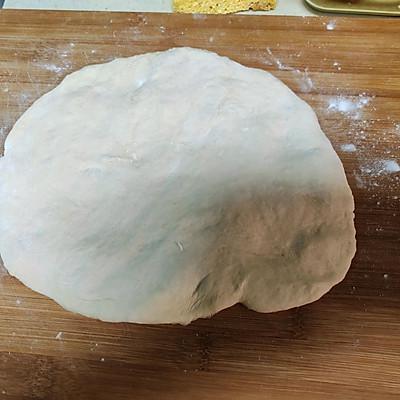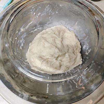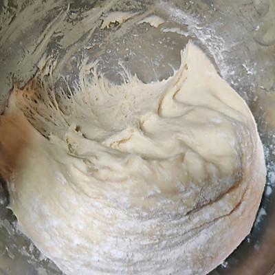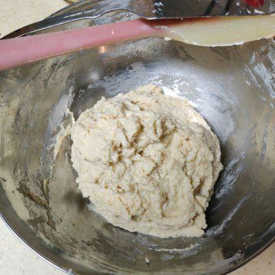 4、用硅胶铲搅拌至无干面粉。此时面团较粘,胶粘的那种,下不去手。