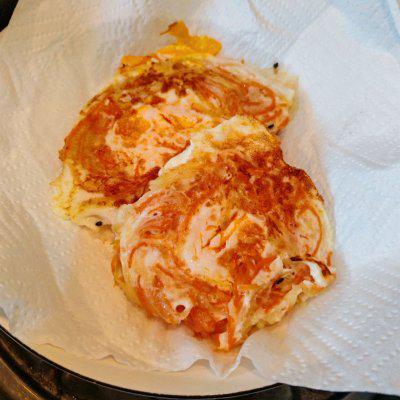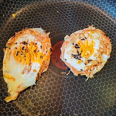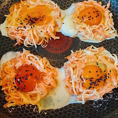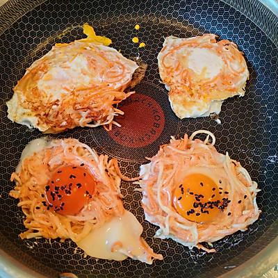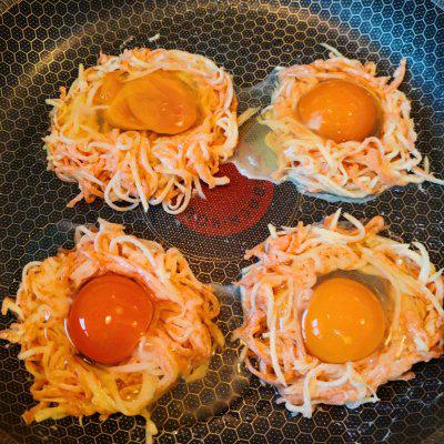 2、用康巴赫的不沾锅,底部喷一点油,把土豆丝和葫萝卜丝整理成鸟巢样,每个里面放一个太阳蛋,用的土,颜色好看不,然后提胃口。让我们耐心等待。