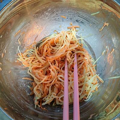 1、早上起来太忙了。晚上提前把树荫萝卜擦干净,用开水煮几分钟。这很容易烹饪。早上把土豆丝擦干净,土豆容易变黑。现在还不如用。撒一点盐,可以软化蔬菜,增强味蕾,整理成型。这一步很重要。