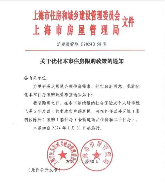 2024 年 1 月 30 日上海官宣外环外放开单身限购。