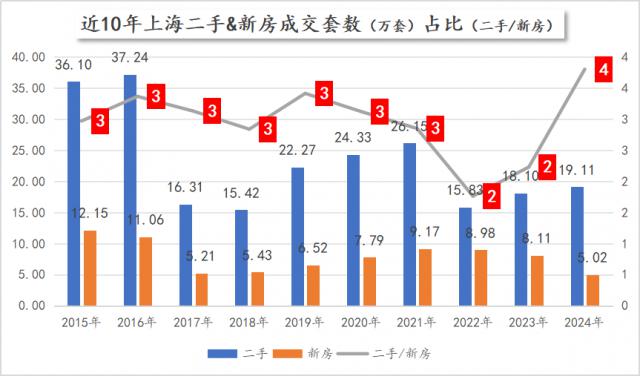 相当于说 2024 每年都有上海楼市成交 1 在新房的同时,要进行整体交易 4 套二手房