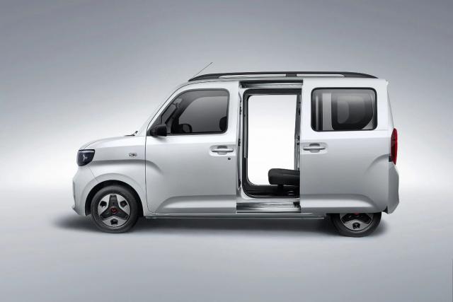 看外面,五菱之光 EV 采用了相当可爱的方正造型,极具日本气息 K-Car 汽车的气息,它的车身只是 3.7 米,轴距 2.6 米饭,但高度超过了 1.7 米饭,这种造型带来的好处就是体积小,但是实用空间大,而且侧面还配有侧滑门,可以算是把实用性贯彻到底。