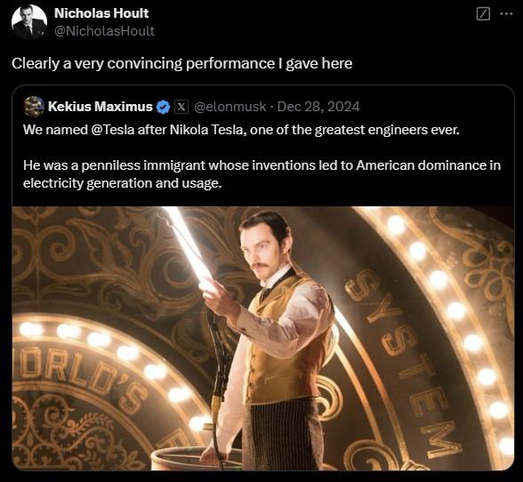 另外,马斯克提到了尼古拉的公司名和发明家。 · 特斯拉的起源并没有释放交流电先驱的真人照片,而是选择了电影《电力之战》的剧照,演员尼古拉斯。 · 影片中霍尔特扮演特斯拉: