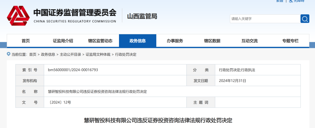 12月31日, 山西证监局对于老牌投顾公司 慧研智投给一张罚单。