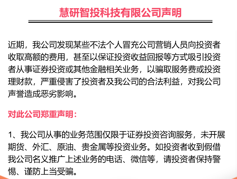 记者注意到,汇研智能投资官网发表声明称,近日,公司发现一些非法个人假冒销售人员向投资者收取高额费用,甚至以保证投资收益的形式吸引投资者从事证券投资或其他金融相关业务,以骗取服务费或投资理财资金,并表示“任何以我公司名义冒用的行为后果都与我公司无关,请区分”。