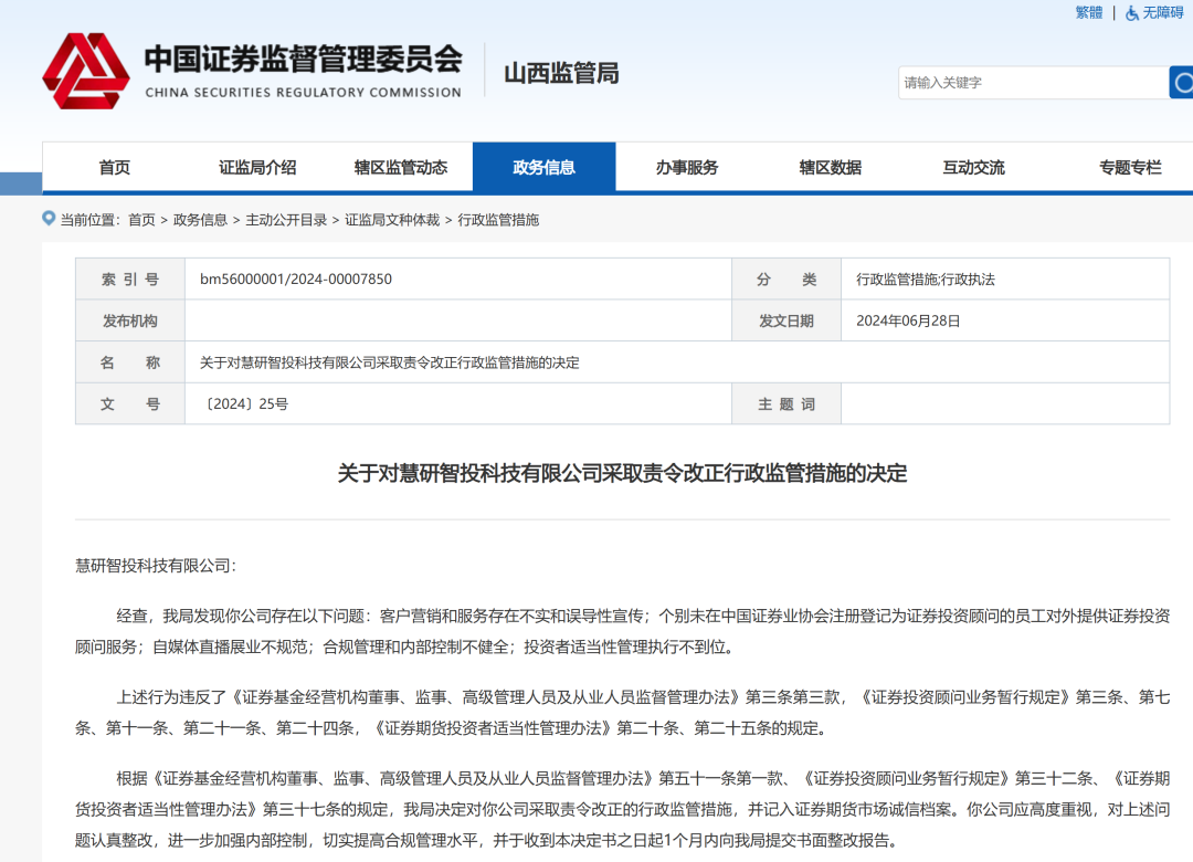 2024年6月,慧研智投最近一次被罚。山西证监局发现,该公司的客户营销和服务存在虚假和误导性宣传;一些未在中国证券业协会注册为证券投资顾问的员工提供证券投资顾问服务;自媒体直播展业不合规;合规性管理和内部控制不完善;证监局决定采取行政监管措施,责令投资者适当性管理不到位,并将其记录在证券期货市场的诚信档案中。