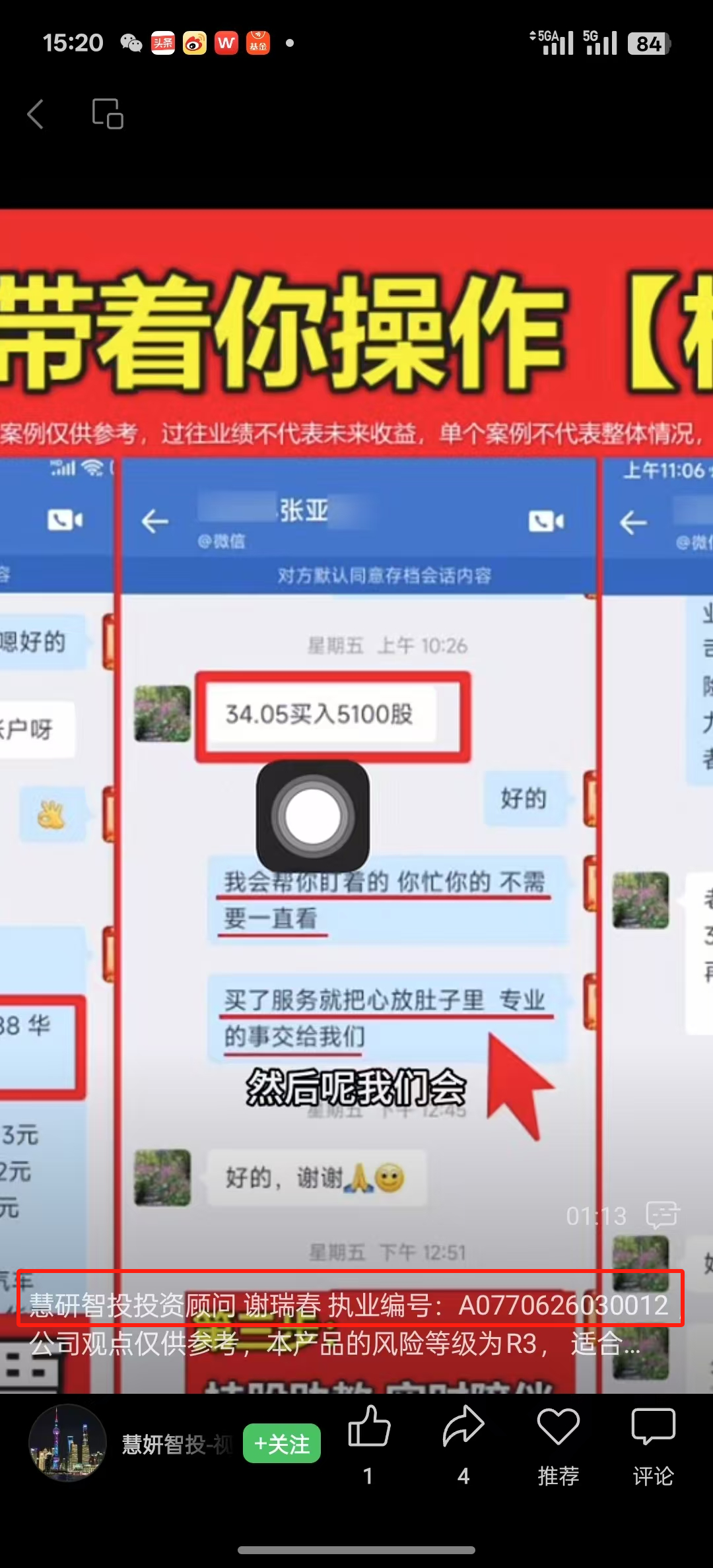 上图所示的惠研智投投资咨询谢瑞春,经记者核实确实有其人,但视频中显示的就业编号与中国证券业协会注册的就业编号不符。