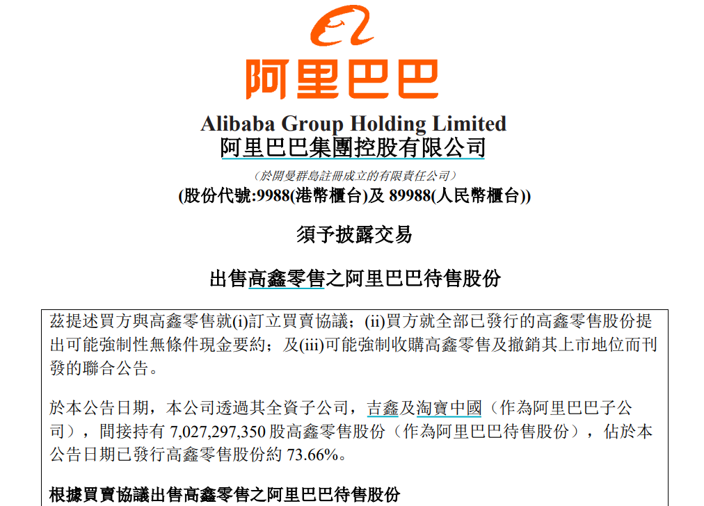 阿里以131.38亿港元的最高价格出售高鑫零售股份。