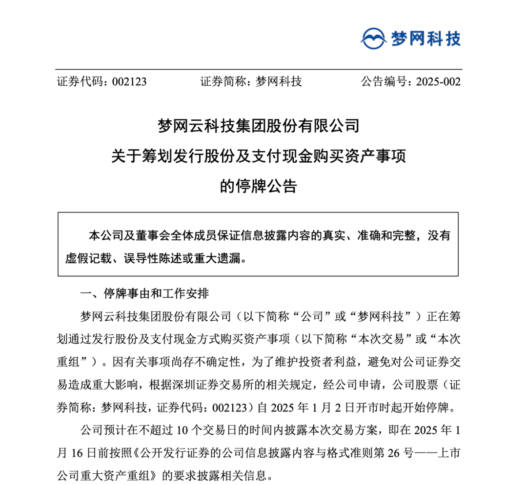 公告显示,梦网科技正计划通过发行股份和支付现金来购买资产。根据深圳证券交易所的相关规定,为了维护投资者的利益,避免对公司证券交易产生重大影响,公司股票自2025年1月2日开市以来开始停牌,原因是相关事项仍存在不确定性。