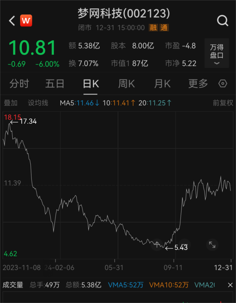 梦网科技截至2024年12月31日收盘,每股10.81元,全年下跌3%,最新市值87亿元。