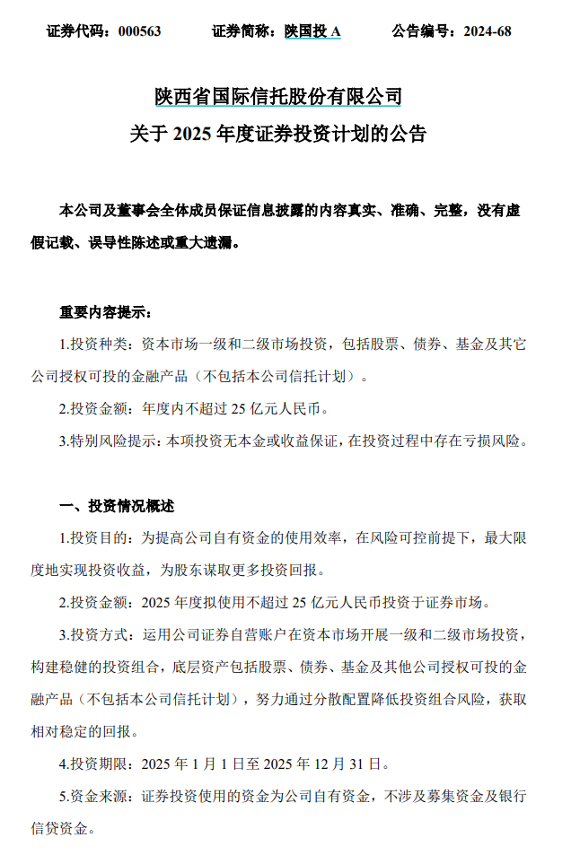 1月1日,陕国投A公告,在风险可控的前提下,最大限度地实现投资收益,以提高公司自筹资金的使用效率,该公司计划在2025年投资不超过25亿元的证券市场。