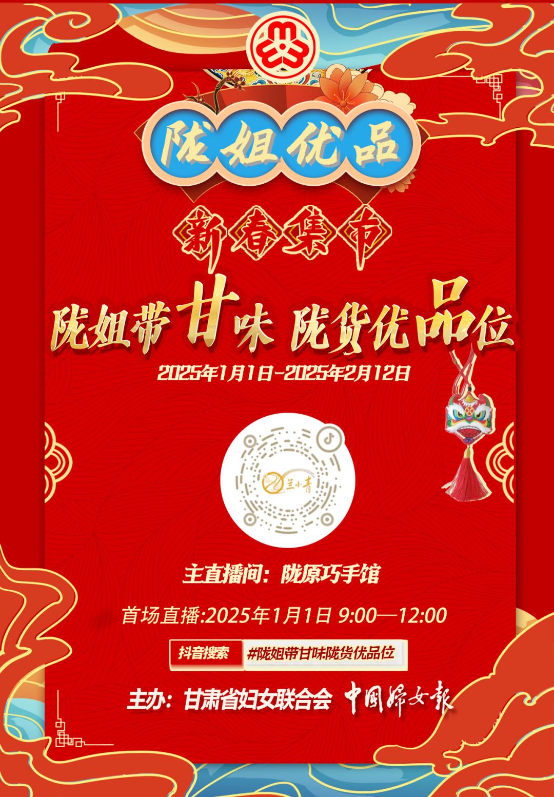 2025年1月1日早上9:00在省妇女儿童服务中心陇原巧手馆(主要直播间)正式开放。您可以通过以下两种方式进入直播: