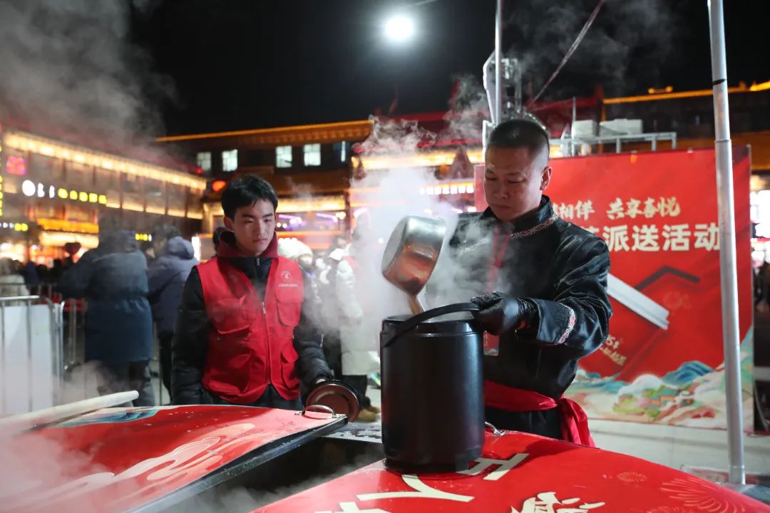 此外,阿勒坦汗广场搭建了一个2.5米的大锅,用来煮奶茶。寒冷的天气阻挡不了香味,到处都是。活动专门为市民分发了“新年盲盒杯祝福”,增强了参与性和趣味性。一杯热奶茶暖心养胃。本次活动以奶茶为基础,将美食与文艺活动相结合,与大家一起用“冬季第一杯奶茶”迎接新年。