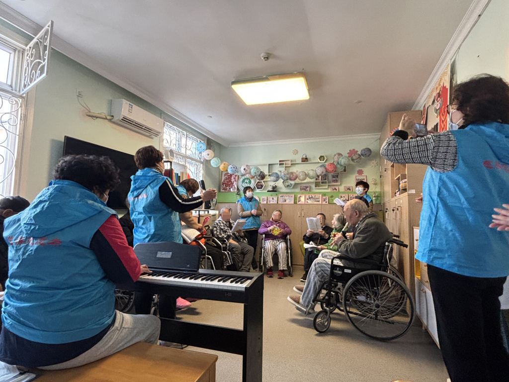 《团结就是力量》《洪湖水浪》《北京金山》...老施和活动室的老人后来唱歌了,一个爷爷还戴着竖笛,用旋律咿呀学语。一周后,在音乐组的特别演出中,志愿者们还带来了一架电子琴,带着老人大声唱歌。