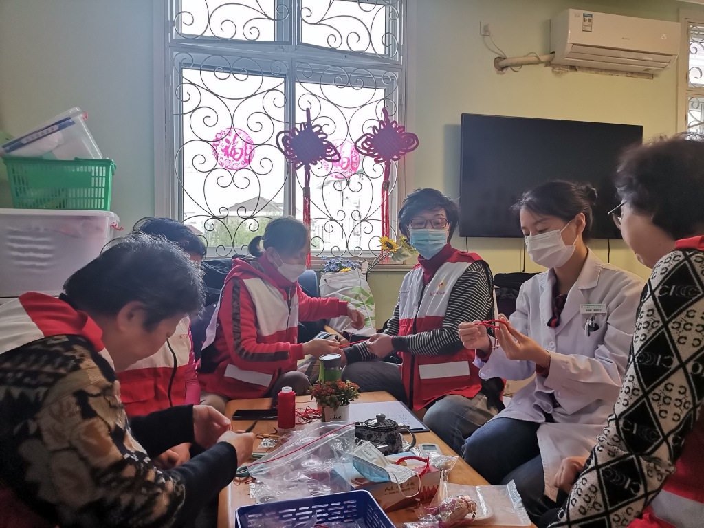 志愿者们做手工红绳,送给医院的老人。