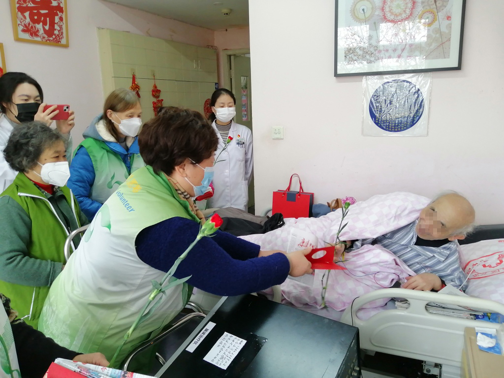 当然,大多数不能参加活动的安宁病房老人。现场活动结束后,志愿者们进入病房,与床上的老人和照顾老人的家人聊了一会儿。