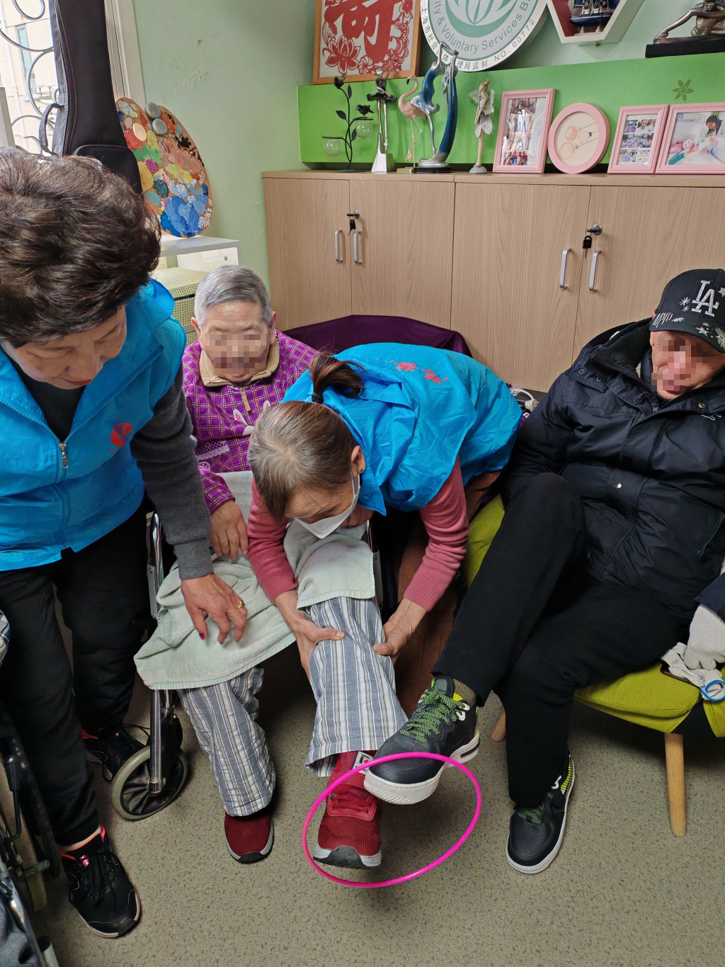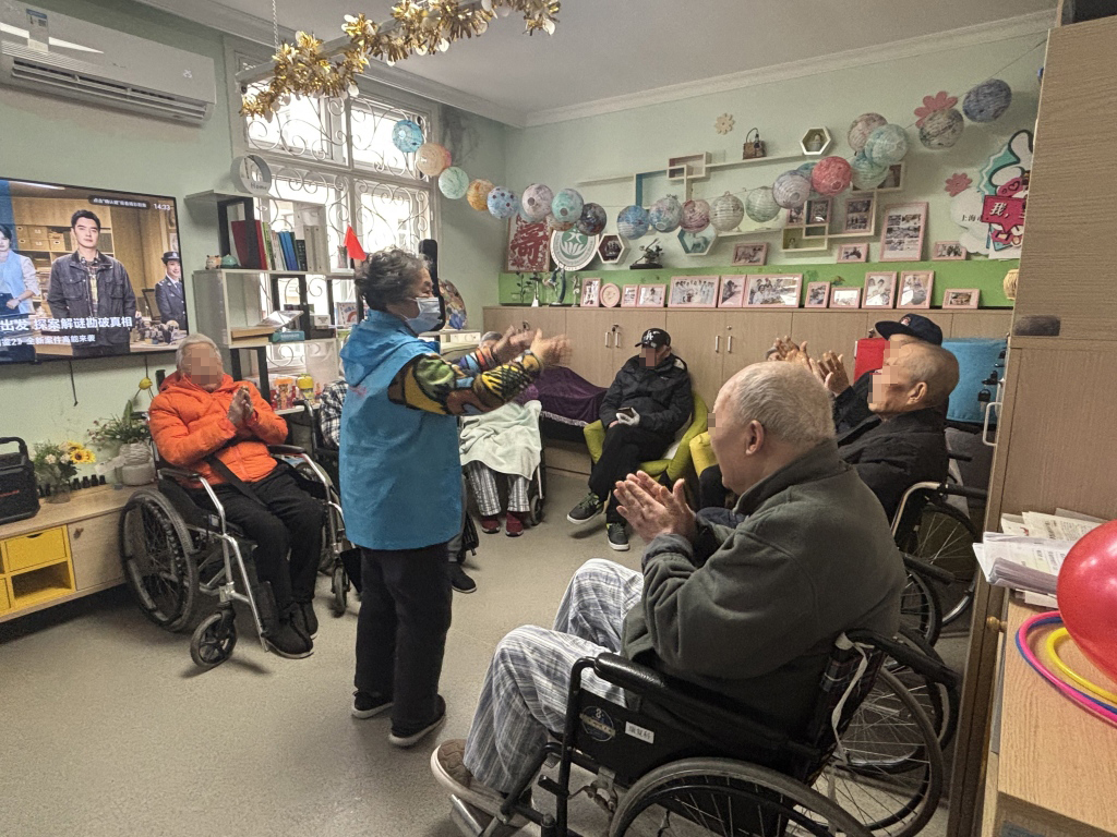 2024年12月19日下午2点,在上海长宁程家桥街道社区卫生服务中心,8名老人陆续被拖进轮椅或四楼活动室。轮椅上的小芳奶奶穿着兔子罩,看到六个穿着蓝色背心的志愿者“姐姐”,笑容可爱。“你来了吗?”