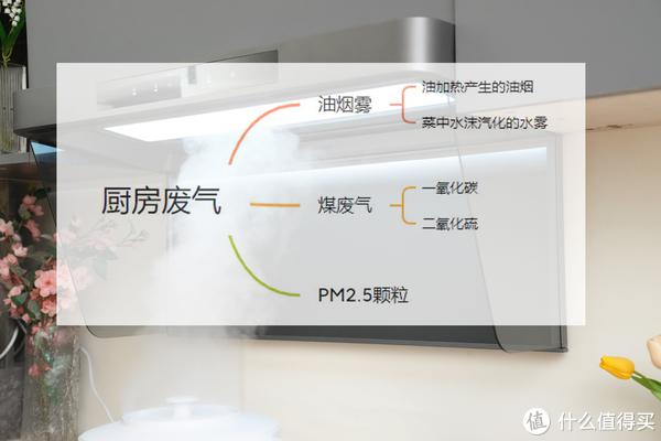 包括在高温下吸收食用油气化形成的油烟;水蒸气水蒸气和食物分子在烹饪过程中混合形成可进入肺部 PM2.5;一氧化碳和硫酸盐没有完全燃烧;燃烧后产生的二氧化硫等。