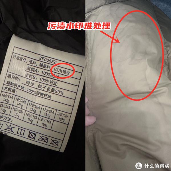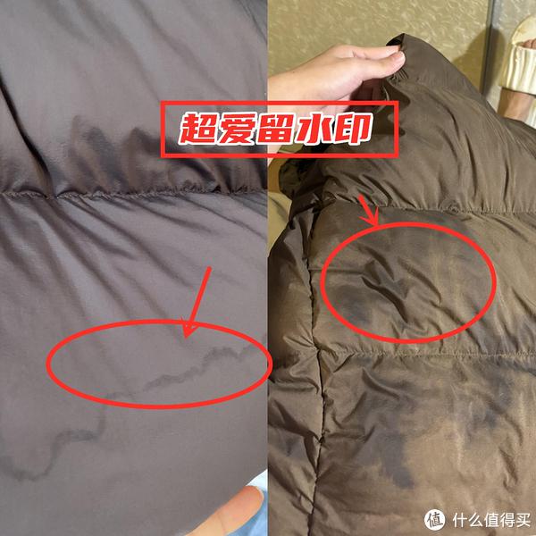重点是,洗涤也不一定能洗干净,这种颜色的羽绒服非常喜欢留下痕迹,洗完之后,很有可能会有一些水痕残留,很明显的黑色一圈一圈的印痕,压根就穿不上。。▼▼