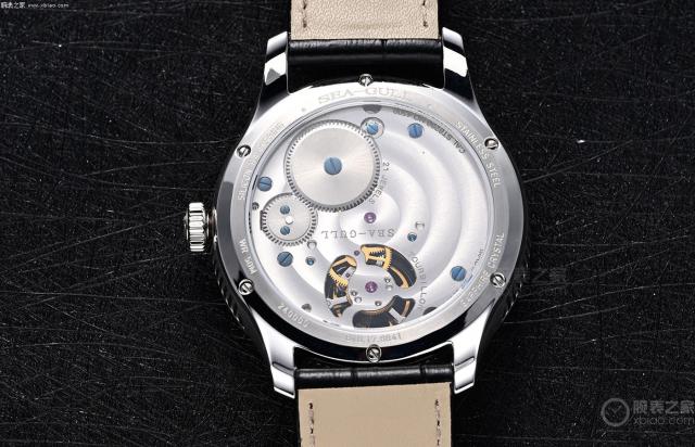 把表背翻出来,里面装的是 ST8260 同轴陀飞轮采用同轴设计,可以减少运动内部的摩擦和磨损,从而提高运动的运行效率和稳定性。该运动的振频可以实现 21600 次 / 上满链可以提供一个小时。 55 小时动力储存,满足日常使用要求 .