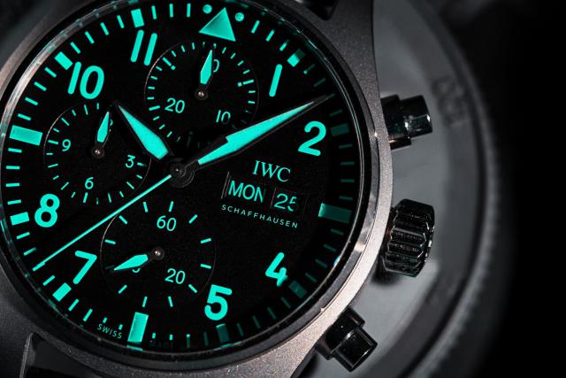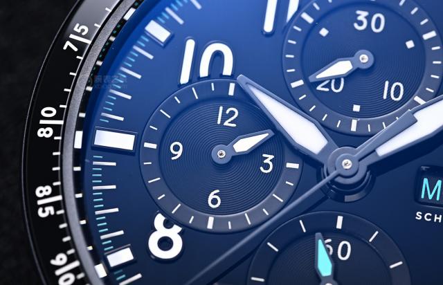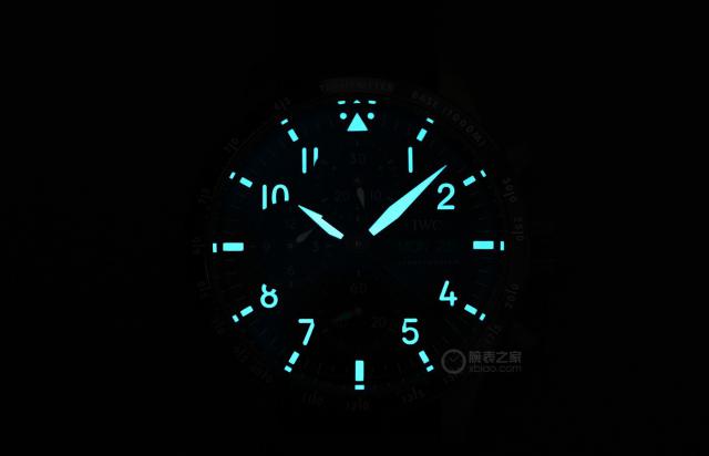虽然盘面布局与飞行员记时一致,但其细节更加丰富。盘面采用立体时标,所有时标均有夜光涂层。一般来说,飞行计只有 4 一个点有夜光。