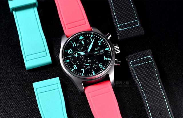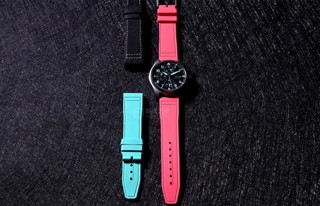 而且飞计“马石油”的识别度,不仅在表头上,而且在表带上也很有力量。世界各地都为飞计“马石油”前后配备了 3 一种表带。分别是“马石油绿”缝线的黑带、“马石油绿”带、“迈阿密粉”带,尤其是两条彩色胶带,颜色独特,光看表带就能一眼识别出来。