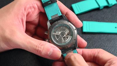 而且现在的万国飞计基本都有了。 EasX-CHANGE ® 表带快速更换系统,针扣也快速拆卸,方便佩戴者不需要工具,徒手随意切换。操作模式也在上面的动画中给大家展示。抵住表带按钮,拆下下来。设计非常方便牢固。绿色、粉色胶带和各种酷炫的表带可以随时更换,轮流“炸街”。