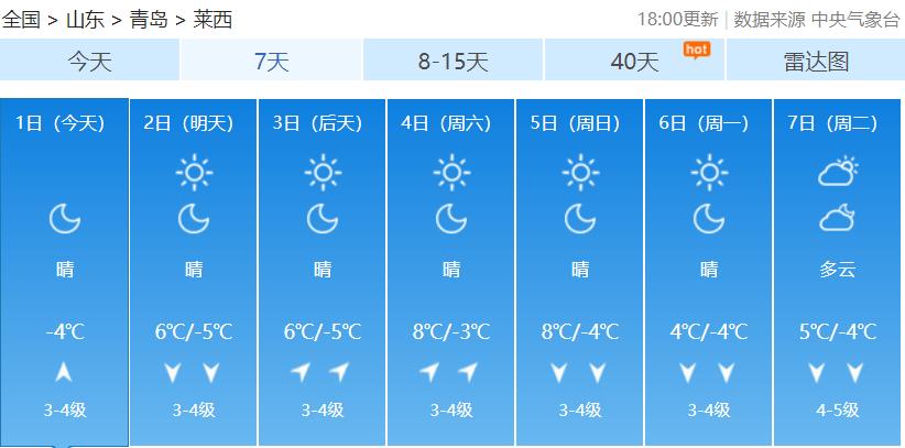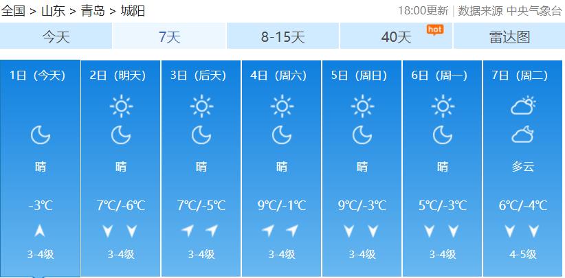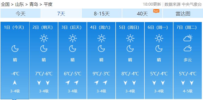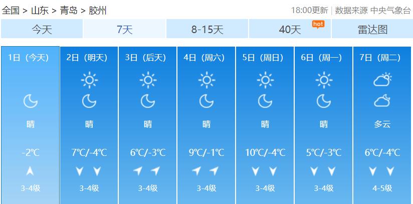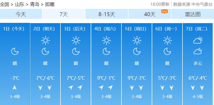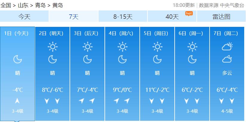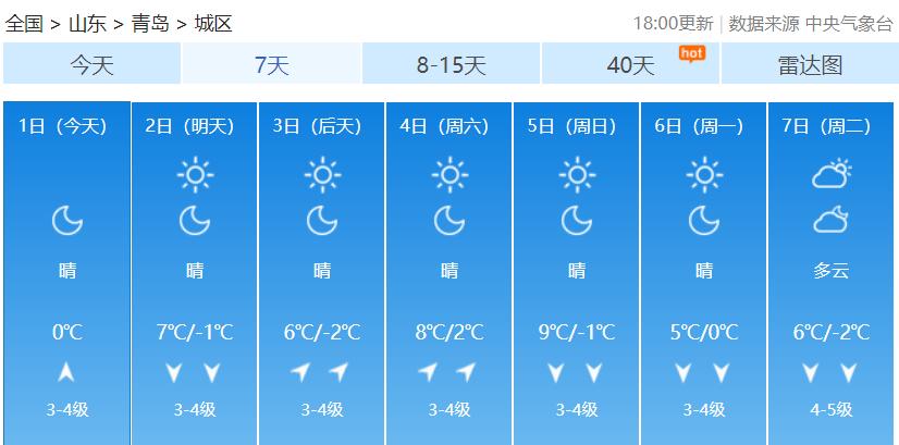 [青岛城区]今日白天,晴间多云,北风3-4级,相对湿度为40%-90%,今日最低温度为0℃,最高温度为7℃。
