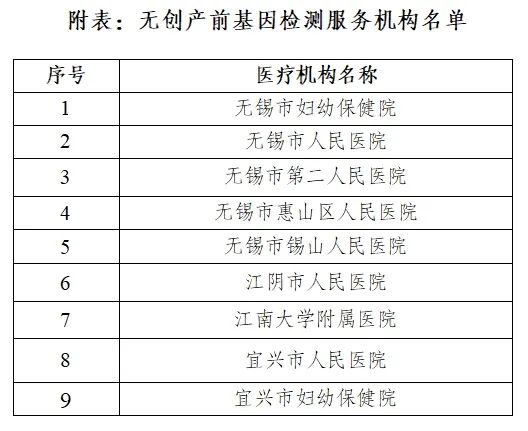 适龄孕妇可前往全市9家医疗机构进行无创产前基因检测(见附表)。