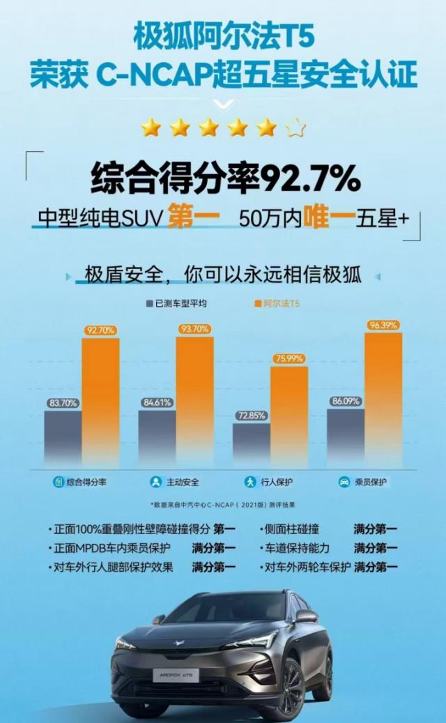 阿尔法是客户最关心的电动汽车安全方面, T5 在中汽中心 C-NCAP 综合得分率在最新碰撞测试中 92.7%,超过了历史上所有参与评估的中型纯电。 SUV,更是 50 唯一获得五星的万内 成绩车型。