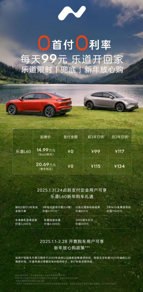 选择乐道品牌 0 首付 5 年度金融计划,购买 BaaS 租电的乐道 车辆价格为L60 14.99 万元,前 3 年日供 99 元,后 2 年日供为 117 人民币;如购买全车, 3 年日供为 115 元,后 2 年日供为 134 元。
