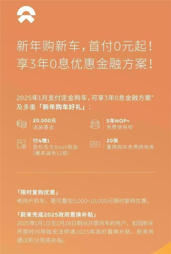 2025年为蔚来品牌 年 1 每月支付定金买车,可享用。 3 年 0 利息金融计划和多重“新年买车好礼”。