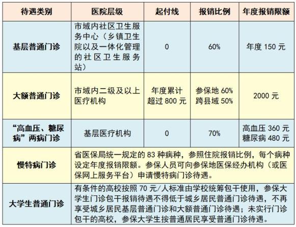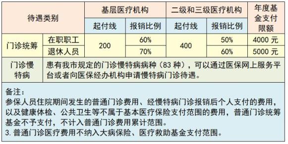 基层普通门诊医保基金一次性支付限额分别为50元和20元,取消居民在基层医疗机构、一体化管理的村卫生室和社区卫生服务中心;取消大额门诊一次医疗费用,达到200元的支付限额,将年度支付标准调整至800元。