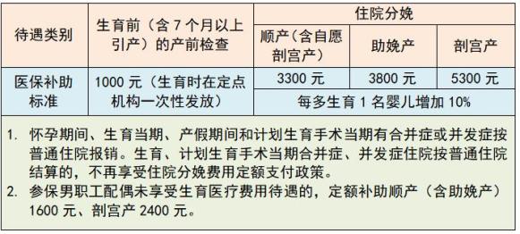 参保居民符合门诊要求的产前检查相关医疗费用纳入门诊保障,享受普通门诊待遇。住院分娩医疗费用定额补贴自然分娩(含助产)1600元,剖腹产2400元。