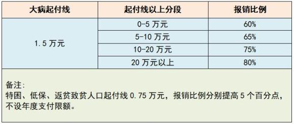 根据省统一规定,大病保险“基金支付比例在5万元以上10万元以下的70%”调整为65%,“基金支付比例在20万元以上的85%”调整为80%。