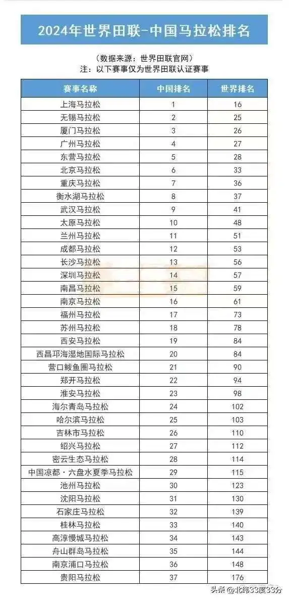 近日,世界田联公布了2024年世界马拉松排行榜。在世界上许多城市马拉松比赛的排名中,国内许多比赛都在名单上。其中,衡水湖马拉松位居世界第37位,中国第8位。