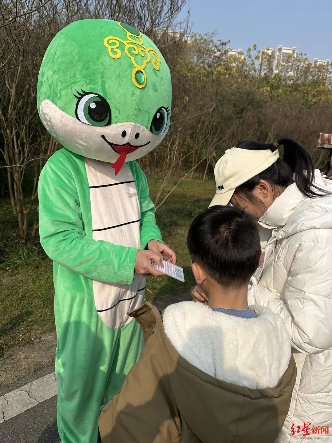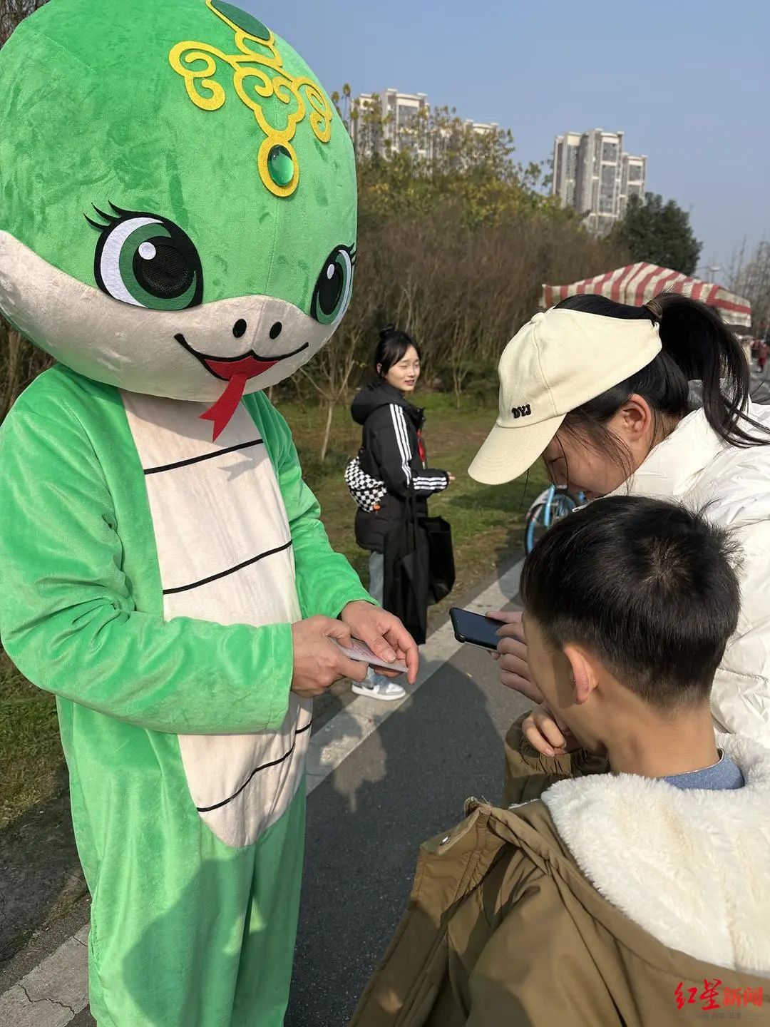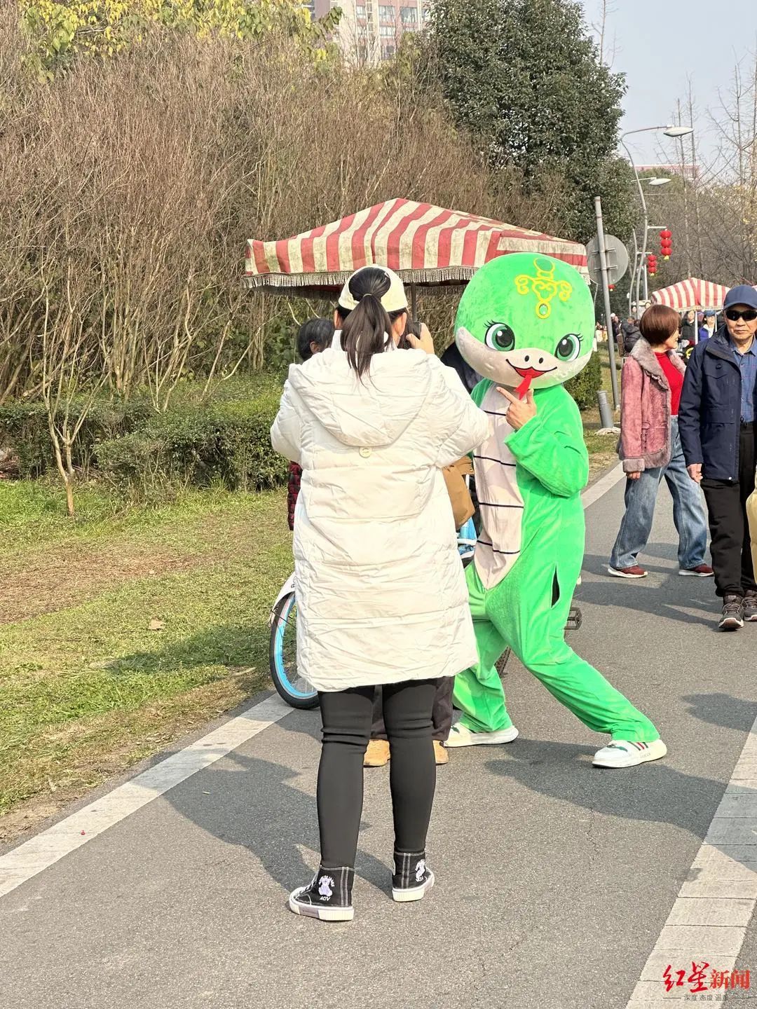 在现场,红星新闻记者见证了陶女士的遭遇。1月1日下午2点,陶女士带着两个孩子去青龙湖湿地公园。她刚走过大门不到200米,一个穿着蛇形娃娃的人热情地走上前去,主动向陶女士示意合影。起初陶女士面带疑惑,但很快,她大概以为是在公园里举办的一些有趣的活动,所以没有拒绝。陶女士在随后的短暂交流中发现这个人是残疾人。事件发生时,她向红星新闻记者描述了当时的心情:“当时想,明年是蛇年,就当是应景,好心配合吧。”