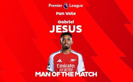 最终,热苏斯赢得了球迷。 48.6% 投票,以更大的优势当选全场最佳球员。第二名是姆贝莫,他为布伦特福德进球,得票率很高。 马丁内利排名第三,23.8%。