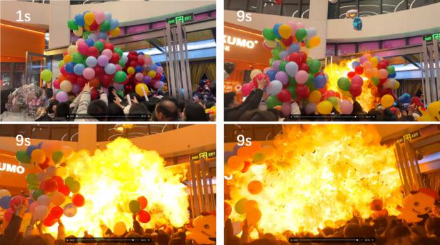 图 1 视频第 群众正在争夺汽球;视频第一 9s,产生黄色火焰,并在 1s 两簇汽球在内快速点燃,现场发生爆炸事故。