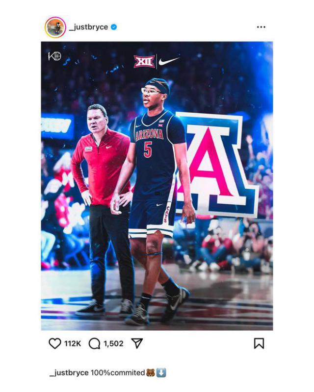 直播吧 01 月 02 日讯 布莱斯,詹姆斯的次子 - 在社会媒体上,詹姆斯宣布将加入亚利桑那大学。