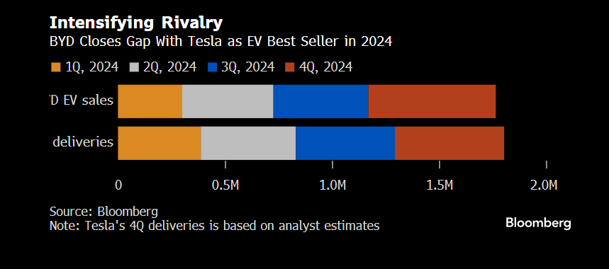 根据12月份的数据,比亚迪的年销售额可能还远远超过特斯拉。在此之前,这家公司只打败了特斯拉一次,那是2023年第四季度。