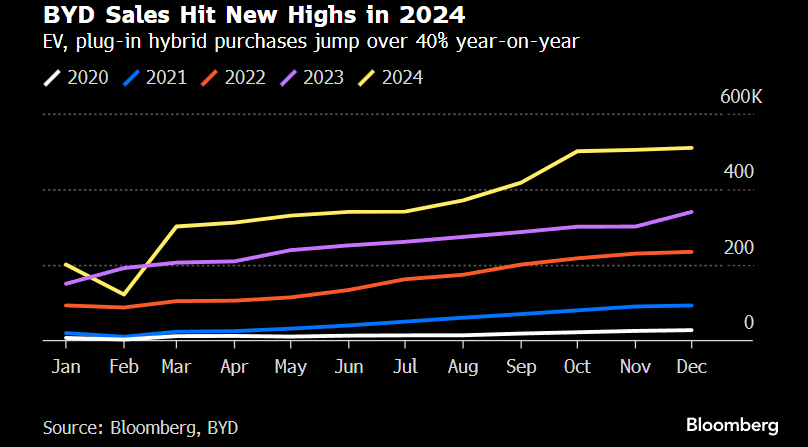 在补贴和给客户提供额外优惠的刺激下,比亚迪在12月份的月销量达到了历史记录水平。年底业绩飙升,比亚迪2024年年销售425万辆乘用车,进一步缩小了与特斯拉的差距。