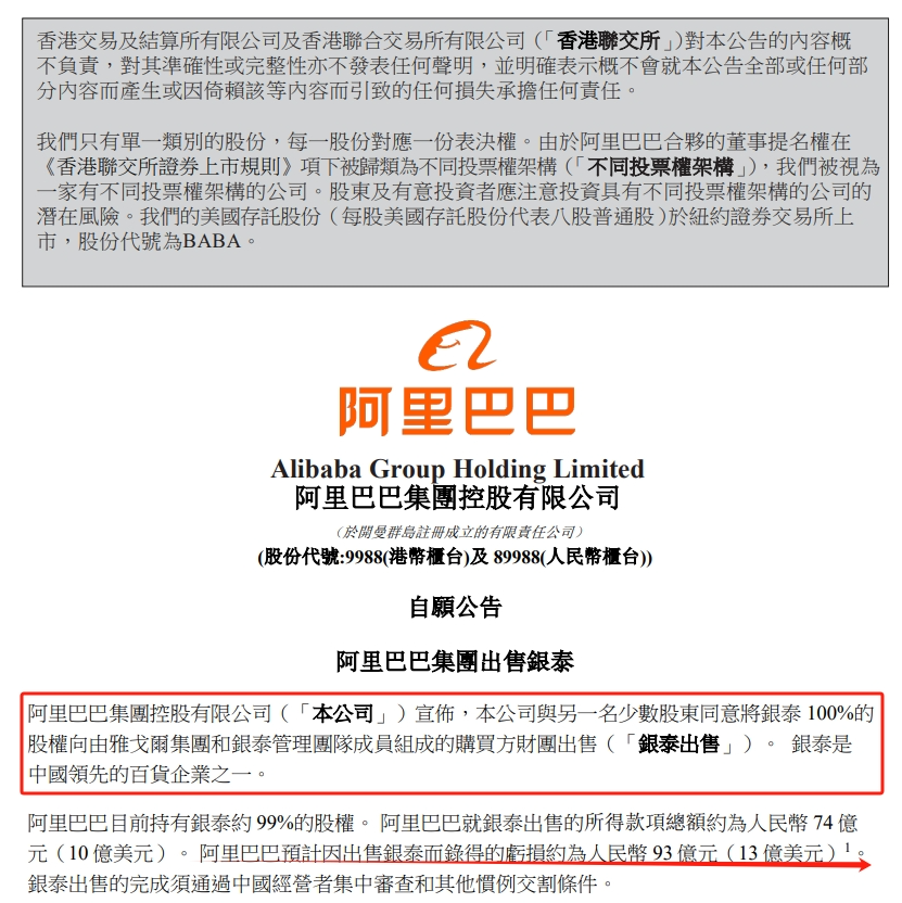 这一变化从阿里巴巴最近的公告中可以看出:企业同意以约74亿元人民币的价格将其持有的银泰百货约99%的股权转让给由雅戈尔集团和银泰管理团队组成的买家财团。